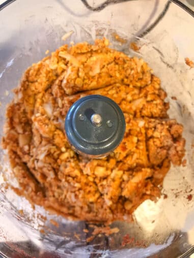 Preparing the burgers is actually pretty easy. You are going to add all of the ingredients EXCEPT the shredded apple and olive oil to a food processor bowl and pulse until everything is well mixed and the chickpeas are fully pureed. Add in the shredded apple and pulse just enough to mix it in, but still leaving some texture.