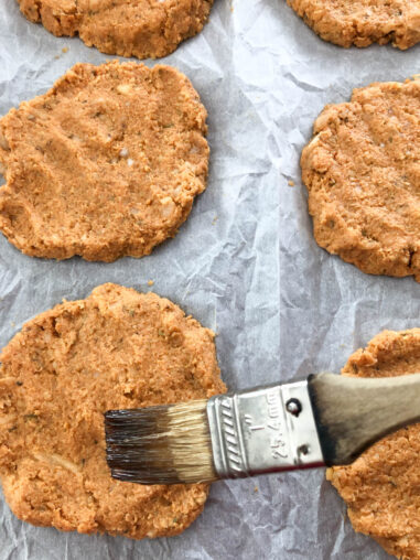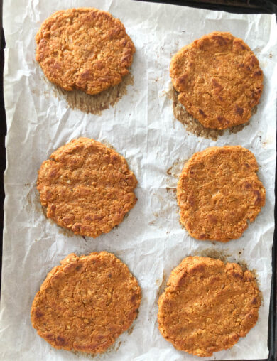 Now let’s dive into the veggie burger recipe! This recipe uses grated apple to add some moisture as well as a subtle flavor. The protein in this burger comes from both pureed chickpeas and a small amount of chickpea flour. The soy sauce, sage and smoked paprika add a robust, earthy flavor that compliments the zing of the apple nicely.