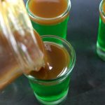 - Remove the shot glasses from the refrigerator and add the melted caramel, filling up to the top of each glass. Allow to harden.