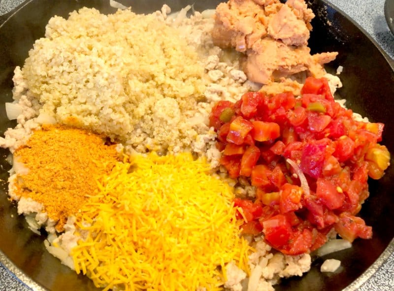 Next, add the refried beans, taco seasoning, half the cheese, diced tomatoes and a cup of cooked quinoa. Stir until well combined and heated through.