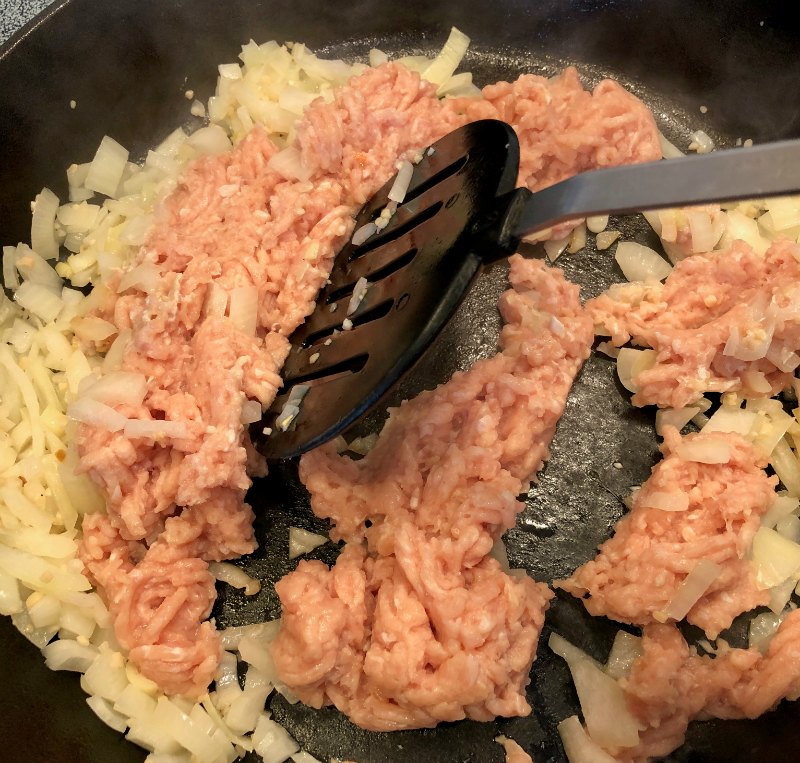 Add the ground chicken and cook thoroughly. Drain if there is any excess liquid or fat.