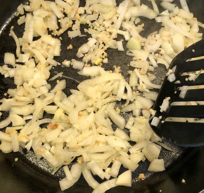 Sauté the onion and garlic in a skillet until the onions become translucent.