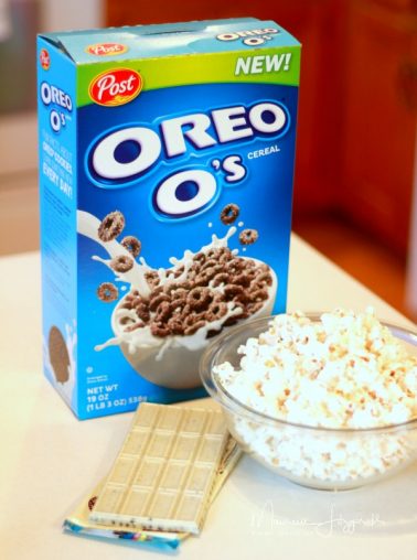 To make Cookies and Cream Popcorn, you will need: a box of Oreo O’s cereal (click here to find it near you), popped popcorn, and white chocolate.