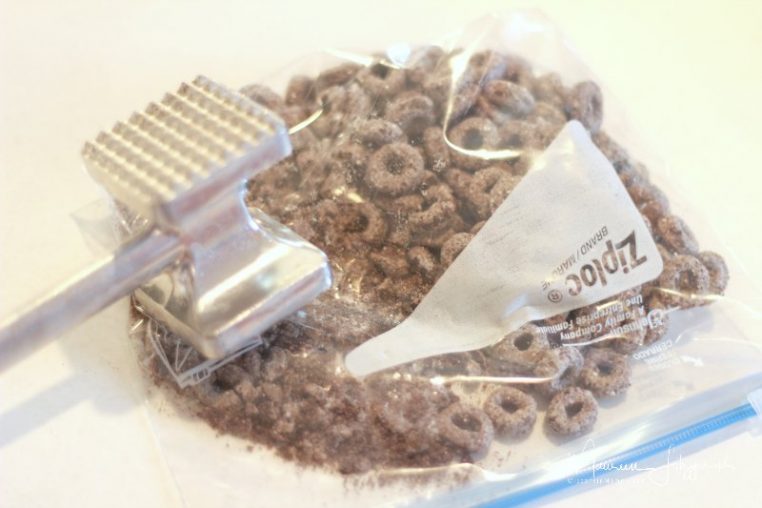 While the white chocolate is melting, put some of the Oreo O’s cereal into a ziplock bag and crush it with a mallet or rolling pin. You can even use the base of a bowl if you don’t have anything else.
