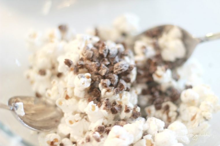 Once the white chocolate is melted, drizzle it over the popcorn a little at a time. Alternate sprinkling the crushed Oreo O’s cereal, drizzling the white chocolate and stirring the mixture.