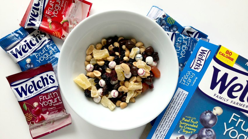 Josh’s favorite combination includes a variety of dried fruit like pineapple, cherries, blueberries and cranberries, peanuts, a little sweet touch with chocolate covered banana pieces and both Welch’s Fruit Snacks and Welch’s Fruit ‘n Yogurt Snacks.