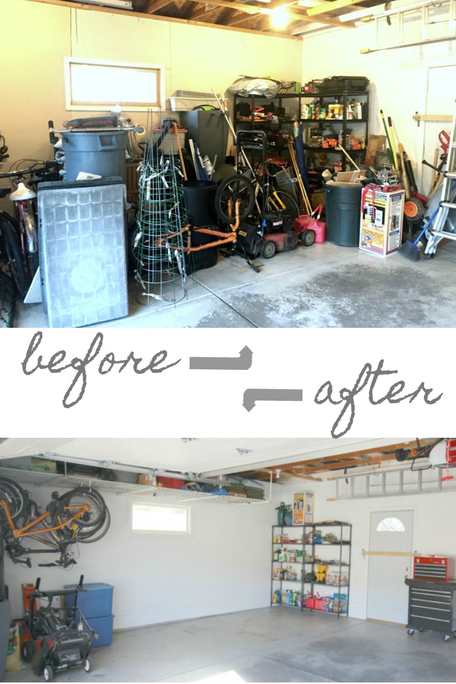 Tip #2 – Make your garage a nicer place to spend time in. Honestly, we put off cleaning out the garage a number of times because it was “too hot” or “too cold”. It wasn’t a fun place to spend time. We fixed that by installing a garage door that was substantially more sturdy than our old one and does a better job of keeping the elements out. The old one was starting to rust and the bottom seal was mostly ripped off.  Jay also insulated the walls and put up an attractive bead board. The garage is actually a pretty nice place to spend time now!