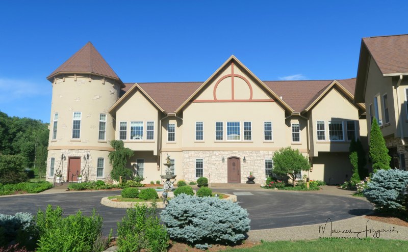 My fellow blogger, Mel from Outnumbered Three to One and I recently had the opportunity to visit Galena and stay at the Goldmoor Inn thanks to a generous invitation from the owners, Slobo and Birgit Radin. Nestled on the banks of the Mississippi river, The inn is located at 9001 N. Sand Road in Galena and is one of the nicest bed and breakfasts I have ever had the pleasure of visiting. At first glance, it looks like a European castle, complete with a turret and “drawbridge” leading to the door of the turret.