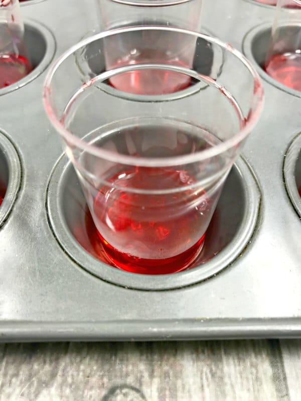 - Fill your shot glasses 1/4 of the way full of red jello and place it to the side.