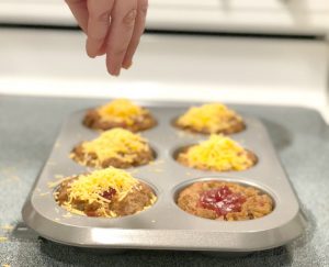 - Bake for 30 minutes. Remove from oven and put 2 to 3 tablespoons of cheese on top of each muffin cup. Place in the oven for 5 more minutes or until the cheese is melted.
