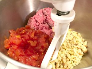 - Preheat oven to 350º F. In a large bowl combine beef, stuffing, tomatoes and water; mix until well blended. Divide into 6 large balls.