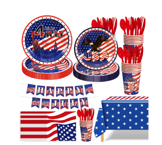 Nothing completes a 4th of July picnic like red, white and blue cutlery, plates, and table decorations. If you are short on time and want these things curated for you, you’ll LOVE this 170 piece set that includes everything from plates to cups to napkins and silverware to banners. Literally everything you need in one package!