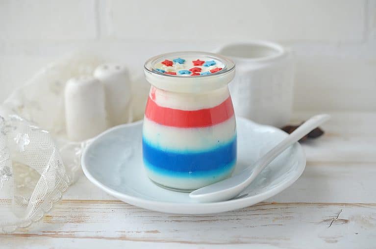 Grab some small jars or cups and start layering: white, blue, white again, red, then one last layer of white on top. It’s kind of like a festive dessert flag situation. Pop them in the fridge to chill until you’re ready to serve.
